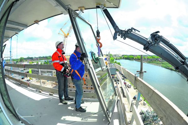 Medewerkers van Rollecate zijn in Amsterdam-Noord bezig met het plaatsen van 36.000 vierkante meter glas voor het appartementencomplex BlackJack.