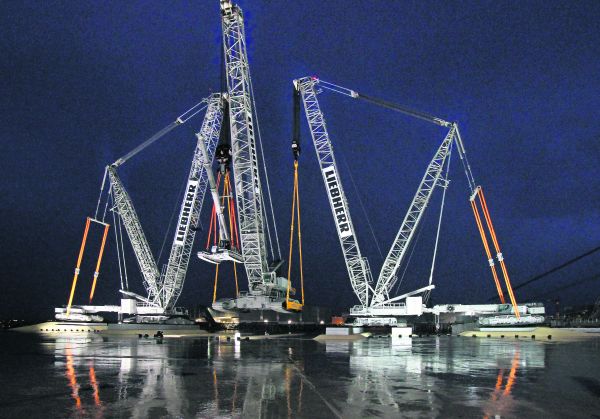 Zes kranen hangen fraai in evenwicht aan een LR 11350, één van de grootste rupskranen van Liebherr, tijdens de klantendagen op de hijskranenfabriek in Ehingen (Duitsland).
