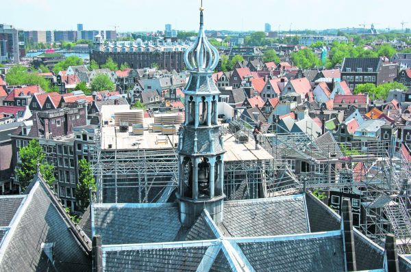 Steigerbouwers van Dejo zijn bezig met het bouwen van de steigerconstructie op de Oude Kerk in Amsterdam. De steigers vormen het tijdelijke bezoekersplatform op de kerk naar een idee van de Japanse kunstenaar Taturo Atzu. Hij wil op deze manier mens en erfgoed dichter bij elkaar brengen.