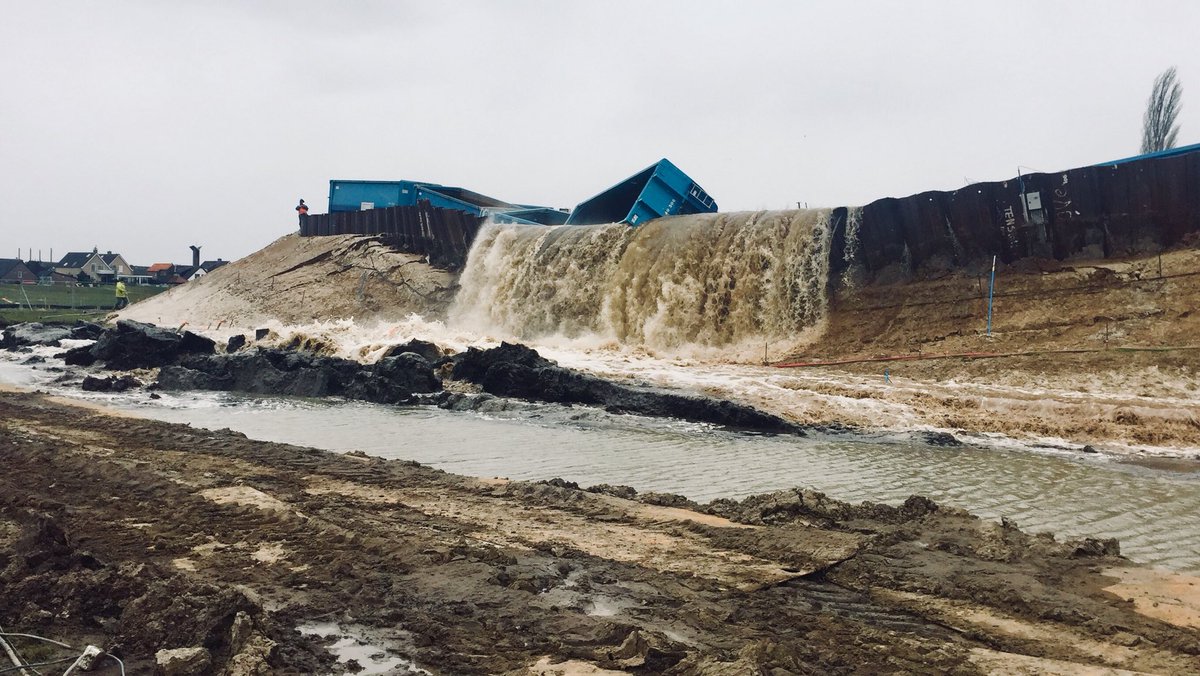 De met lichte damwanden versterkte proefdijk bij Eemdijk is zaterdagmiddag bezweken. Het water stond tot de kruin en de containers bovenop de damwanden stonden nagenoeg vol. Dat is goed nieuws voor Rijkswaterstaat en de waterschappen.