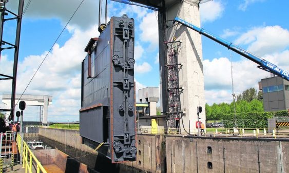 Met het inhijsen van de 190 ton wegende middendeur eind vorige week is de westelijke kolk van de Prinses Irenesluis in Wijk bij Duurstede weer compleet.