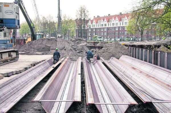 Medewerkers van Van 't Hek zijn aan het werk met damwanden voor de nieuwe Spaarndammertunnel in de Amsterdamse Houthavens.