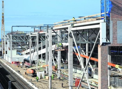 Vanaf de tijdelijke loopbrug over de sporen heeft de reiziger goed zicht op de 300 meter lange busterminal van het nieuwe station in Breda, dat Ballast Nedam en Hurks bouwen.