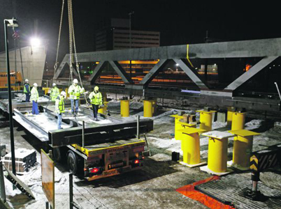 De eerste grote stalen brugdelen voor de Ponte Palazzo zijn in de nacht van donderdag op vrijdag naar de bouwplaats vervoerd, vlakbij het Essent-gebouw in Den Bosch.