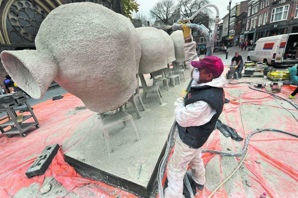 Eindhoven - Terwijl Bedeko Betontechnieken uit Kolham (Groningen) bezig was met het maken van twee eigen kunstwerken van spuitbeton voor de Dutch Design Week in Eindhoven, een Amerikaanse auto en bouwkeet, werd het bedrijf benaderd door kunstenaar Nacho Carbonell. Kon Bedeko ook zijn kunstwerk 'Communication Line' op het Catharinaplein niet nog snel voor de opening