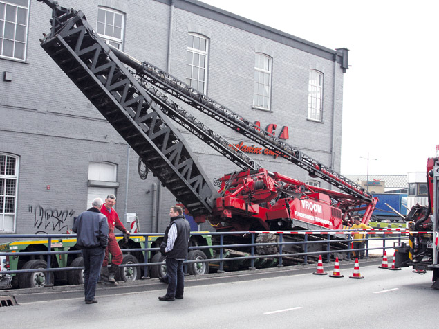 Bij een bouwproject in Helmond dreigde maandag een funderingsmachine van Vroom Funderingstechniek om te vallen.