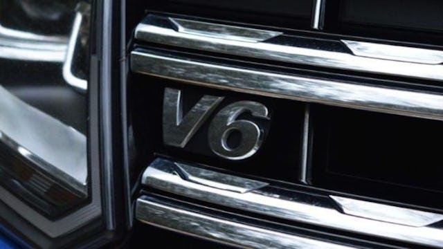 Stoer detail: het V6-embleem in de grille van de Volkswagen Amarok