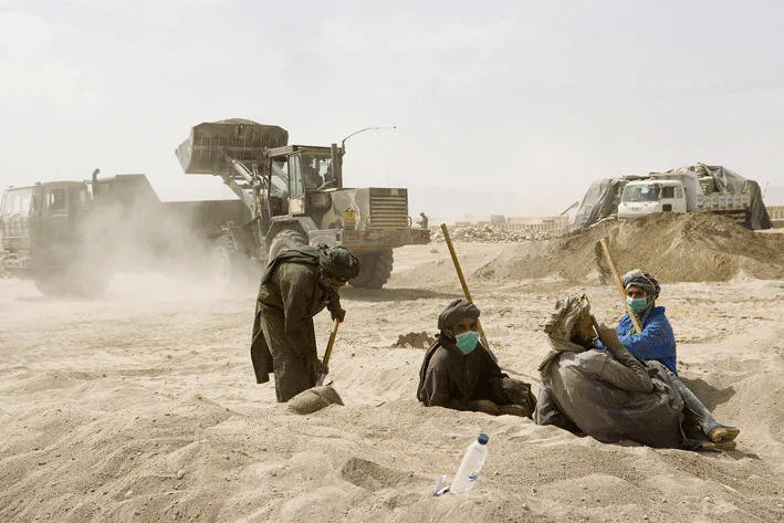 Talloze Afghaanse mannen zijn bezig met activiteiten. Of zoals de Nederlandse soldaten zeggen: met de wederopbouw van hun stad..