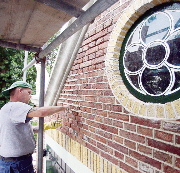 In opdracht van Abma Bouw uit Exmorra is onderaannemer voegbedrijf de Boer uit Bolsward bezig met het voegen van de muur aan de voorzijde van de 130 jaar oude boerderij. Het bedrijf Abma is gespecialiseerd in kunstzandstenen ornamenten. Eigenaar van de boerderij Ad Heddes wilde zoveel mogelijk van de historie van de boerderij - waarin ooit zijn grootouders hun boerenbedrijf begonnen - weer terug in de gevels. Het werk duurt tot eind september 2007..
