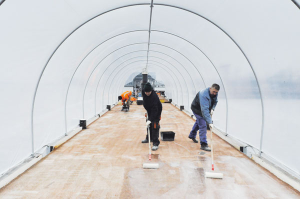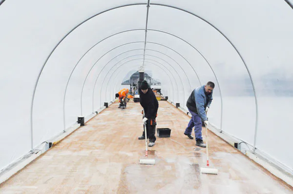 Medewerkers van Rowij Bouwchemie uit Oosterhout vervangen de antisliplaag op de aanlegsteigers van de riviercruiseschepen in het Amsterdamse IJ.